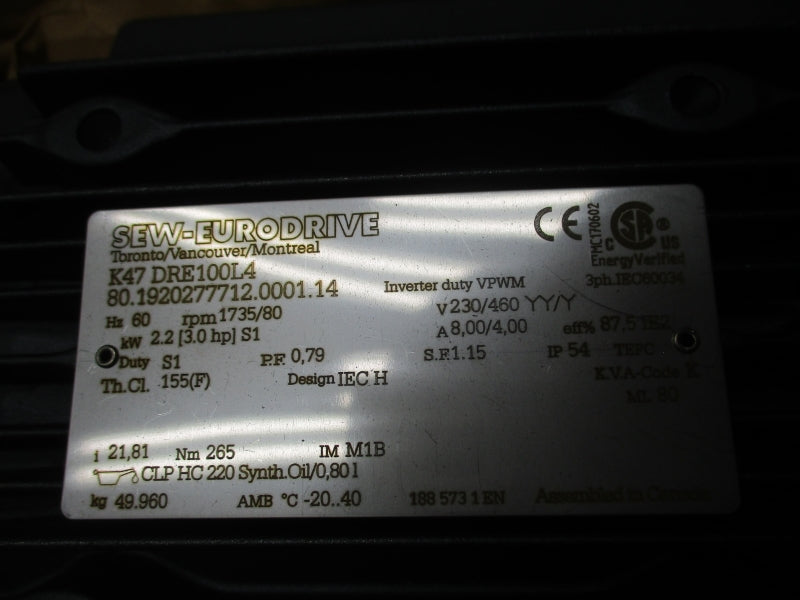 SEW-EURODRIVE K47DRE100L4 230/460V 8/4A NSNP